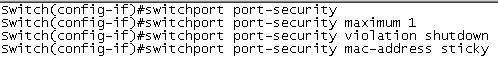 The first command simply activates port security on the switch port, but you still have a few more parameters to set. The next command sets the maximum number of MAC addresses the switch port can learn before a violation occurs, which is what is configured in the third line. The default is shutdown, which as you can guess shuts the switch port down, requiring IT to intervene to see what is happening. Their are two other violation modes you can configure instead of shutdown one of which is protect which will allow the computer with the configured MAC address(es) to communicate with the network while dropping the frames of any other computer with a different MAC address after the violation occurs, however the switch will not increase the violation count so their will be no indication at all that anything is happening until a legitimate user complains, so this will happen without your knowledge. The other violation parameter is restrict which acts very similar to protect but restrict will increase the violation count and sends an SNMP trap so at least their is an indication something is happening. I’ve honestly only used the shutdown parameter, since I really do not see the point behind the restrict/protect since an attack could be attempted without your knowledge, where as shutdown will stop any attempt in it’s tracks, and if your smart and this happens enough you will investigate. Now the mac-address sticky command, simple takes the first mac address the port learns and adds it to the running config, so if the device on other side of the switch port needs to be changed it requires administrator intervention.