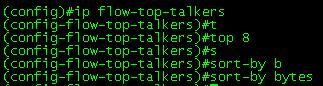 A fairly straight forward configuration, first you enable top top talkers and then configure the parameters you want. You can set top-talkers to sort by the amount of bytes from each end device or by the amount of packets. You can also configure the amount of devices you want to see, anything from 1 device to 200 device I usually prefer to simply see the top 10 devices (well 8 in this case)