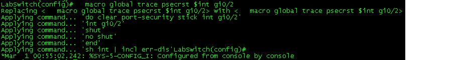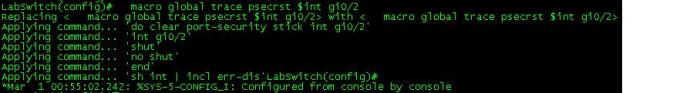 macro name psecrst do clear port-security stick int $int int $int shut no shut end sh int | include err-dis @