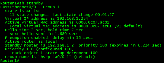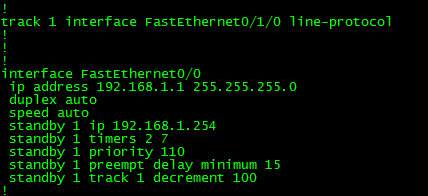 With the exception of the standby keyword this configuration is almost identical to our previous VRRP configuration, and the joy of this is the fact these commands pretty much mean and do the same thing. Standby 1 specifies our HSRP group ID or instance, Standby 1 ip 192.168.1.254 is the HSRP virtual address. Standby 1 timers 2 7 specifies how often HSRP will send out hello packets every 2 seconds in this case and if hello packets are not received within 7 seconds that HSRP speaker is removed from the HSRP group. Standby 1 priority 110 sets this device’s priority within the HSRP group the default priority is 100, and the device with the higher priority is the device that will be the HSRP active router. Standby 1 preempt delay minimum 15 tells this router to take the role of the active router if it were a standby router or if the router has a higher priority and is entered into a group, it also tells the router to wait 15 seconds before taking back the role of the active router. Those 15 seconds should provide enough time for the router to accept any routing updates from its neighbors and have a fully converged routing table so it does not blackhole traffic when it becomes the active HSRP router again. Standby 1 track 1 decrement 100 tells the router to decrement the HSRP priority by 100 if the tracking status of tracking object 1 goes down, and tracking object 1 is configured to track the line protocol of fastethernet0/1/0.