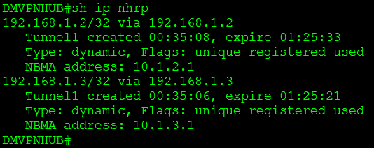 We issue the command sh ip nhrp this tells us we have NHRP mappings to both spokes 192.168.1.2 and 192.168.1.3.