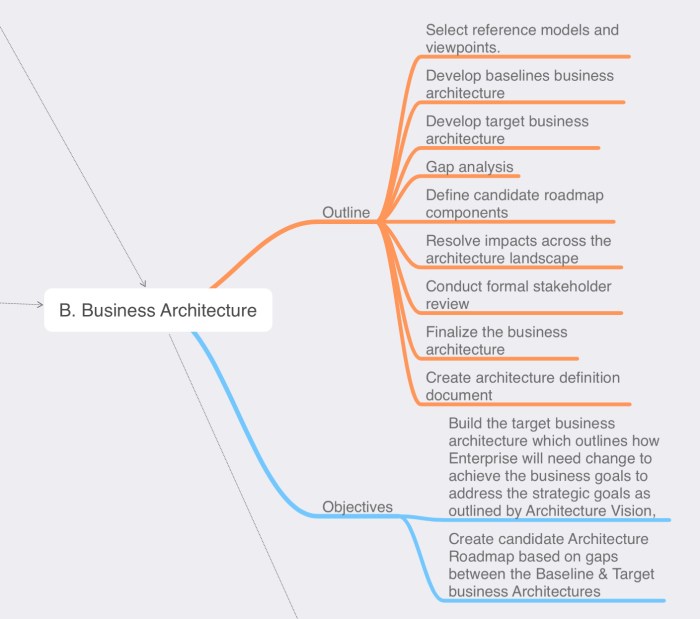 We also need to consider what business processes are existing today (baselines) and what the target business architecture is. Once we know where we want to be, some type of gap analysis will be performed to identify what deliverables need to be implemented in order for today’s baselines architecture to meet tomorrow’s target architecture. Once we have gathered all the information we should have a complete business architecture document.