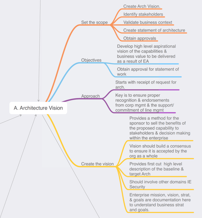 Random Note: I created all the images in this post using a mind mapping application for note taking during my TOGAF studies. Sometimes mind maps can get a little out of control but I hope this format worked out well for presenting the ADM and the high level steps of each phase.