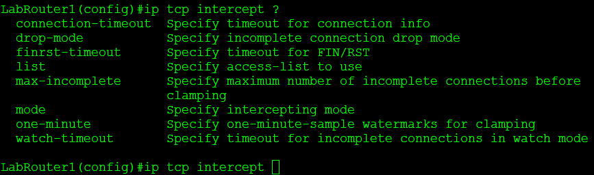TCP intercept is configured from global config mode and we have quite a few configurations options here. I’m going to configure TCP Intercept for both watch and intercept mode and we will go through the configurations: