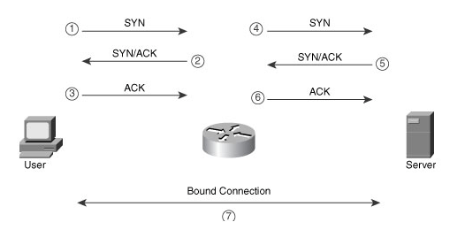 The first of two modes that TCP Intercept operates in is intercept mode. In this mode the router actually accepts the SYN and responds to the source with the SYN-ACK packet, if the client completes the connection by sending the ACK the router then passes the original SYN to the destination and negotiates the connection with server, the client is completely unaware this process is even going on. The only thing to keep in mind with the intercept feature is that the router only keeps track of the TCP packet type, it does not take into account any TCP options within the packet (ie: window scaling or other TCP features within RFC 1323).