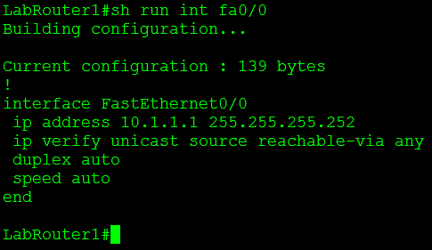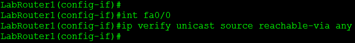 This is a good time to mention uRPF is configured on an interface basis, and it is enabled by a single command. The keyword at the end of the command specifies the mode uRPF operates in, since I am configuring uRPF in loose mode I want to make sure the router can reach the source of any IP packet received on interface fa0/0 using any interface on the router.
