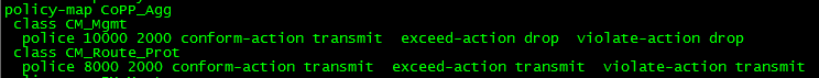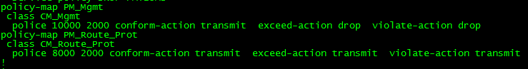 Now, we reference the Class-Maps within a Policy-Map and define our actions: (I’d like to make note, with a CPPr Policy-Map you can only use the ‘police’ or ‘drop’ actions)