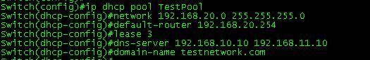 Now the first thing you want to do is define the DHCP pool with the ip dhcp pool poolname command this puts us into (dhcp-config)# mode where we can configure addition parameters for this pool. Next you see the network 192.168.20.0 255.255.255.0 command which defines our DHCP range followed the default gateway, DHCP lease duration (3 days in this case), the DNS Server the for the DHCP clients, and finally the domain name.