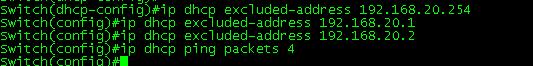 Now the exclusions are done from (config)# mode (but as you can see they can be entered from (dhcp-config)# mode) along with the ip dhcp ping packets 4. The Cisco device will ping an IP address within the pool to see if it available, by default the device will send 2 pings if they both time out it assumes the address is available, here you can see I changed it to send 4 pings.